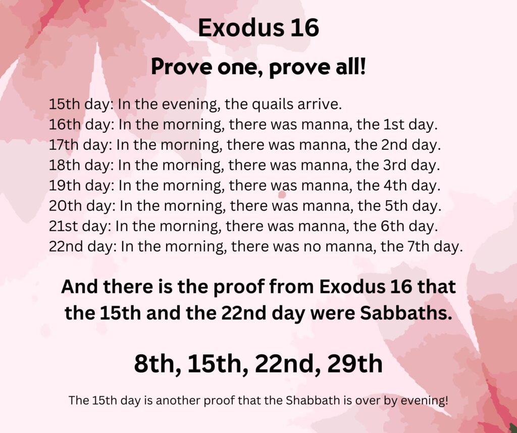 We’ll discuss it again later, but for now, if there’s a new moon day, which the Word mentions so often, the Sabbath cannot be every 7 days consecutively. The 4th commandment tells us, to work 6 days and rest the 7th day. It doesn’t say every 7 days is Sabbath.