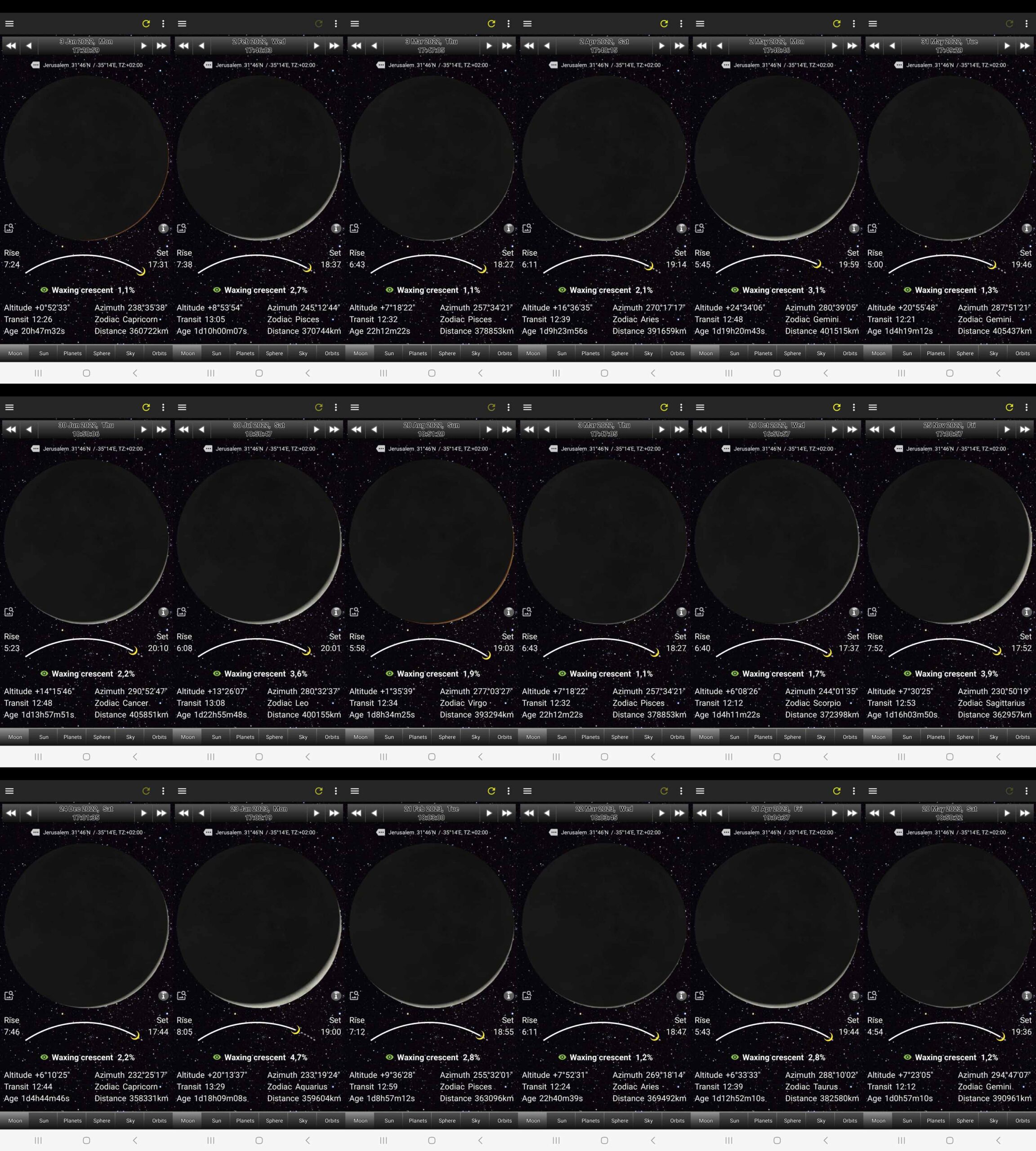 This is the interpretation of man. What does Nature, the faithful witness that no man can change, say? Below is an image of 18 new moons in Jerusalem, in sequence, from 3 Jan 2022 to 20 May 2023. In this set should be two beginnings of the year. Does nature point them out to us?