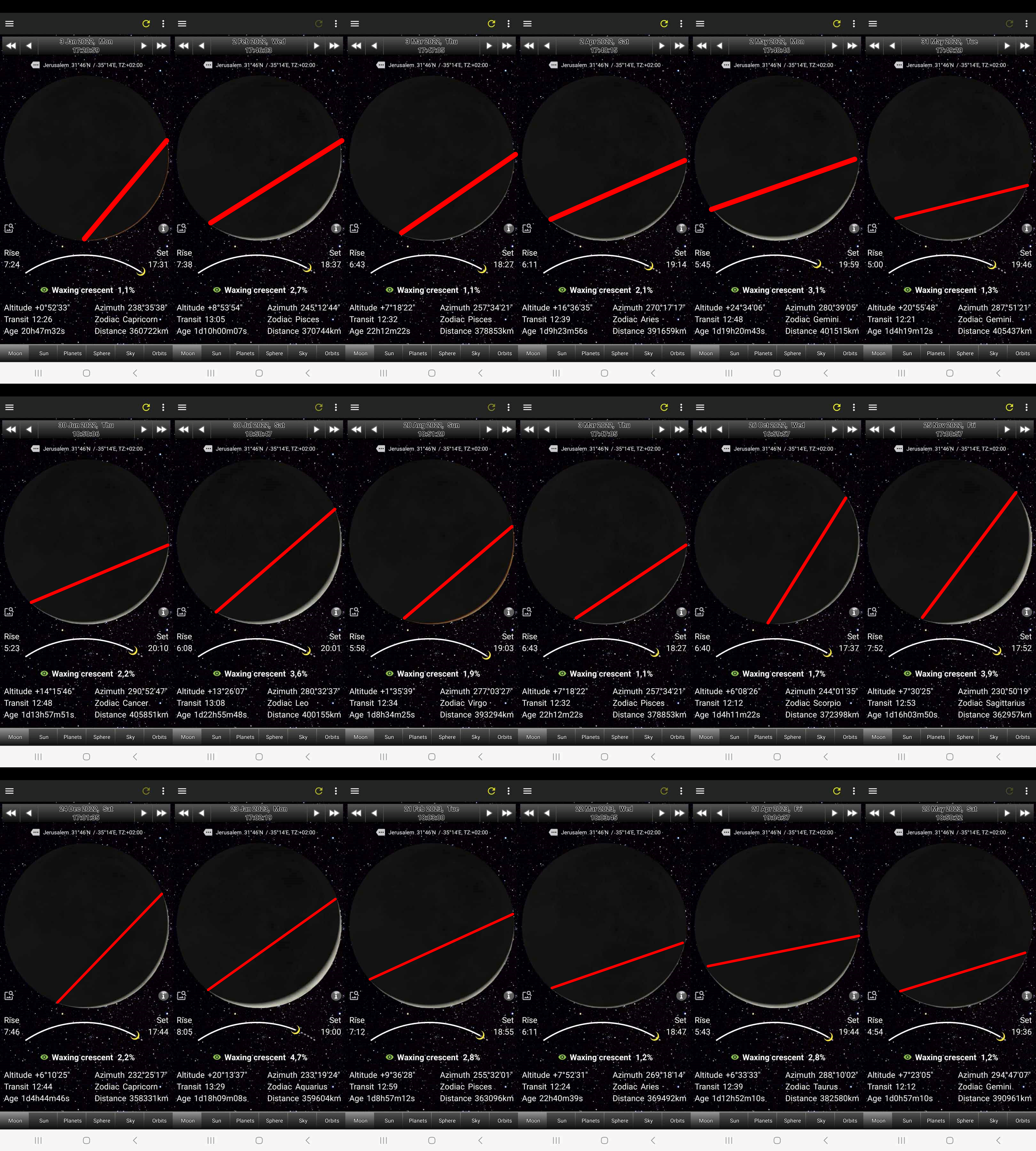 This is the interpretation of man. What does Nature, the faithful witness that no man can change, say? Below is an image of 18 new moons in Jerusalem, in sequence, from 3 Jan 2022 to 20 May 2023. In this set should be two beginnings of the year. Does nature point them out to us?