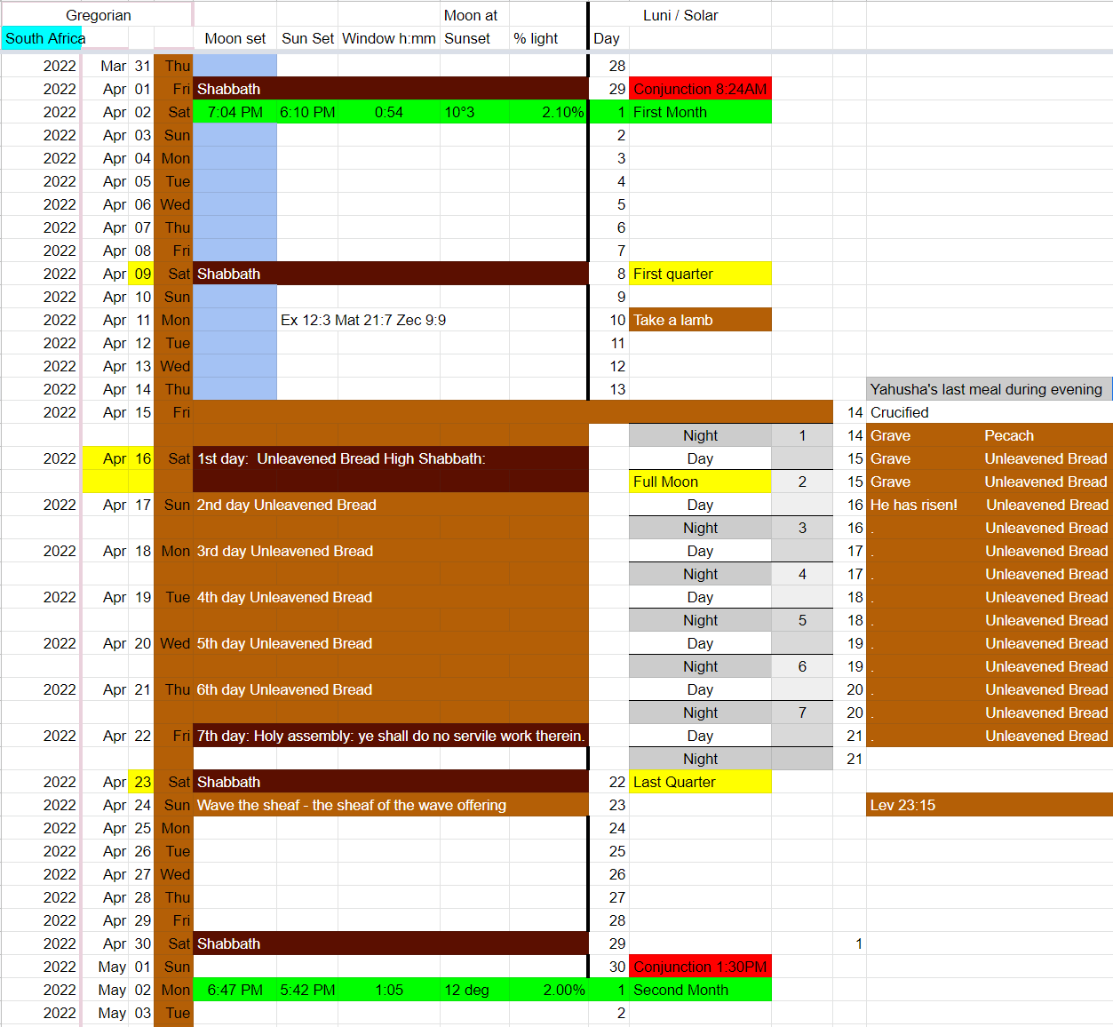 Day 14 to day 21 on this calendar is split into day and night because Pecach start in the evening of the 14th day, and the feast lasts for seven days till the 21st day in the evening. It is split so you can count which days the seven days are more easily—the 7days end on the evening of the 21st day. Then night starts. We see that the night of the 21st day has nothing to do with the feasts. Then, the morning at sunrise of the 22nd day is the weekly Shabbath.