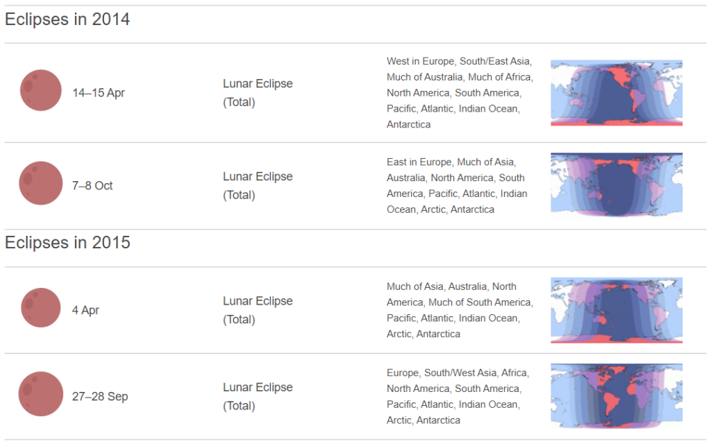 A series of four consecutive total lunar eclipses with no partial or penumbral lunar eclipses in between is called a lunar tetrad. In recent years, eclipses in a lunar tetrad have also been popularly called Blood Moons. This usage of the term has no technical or astronomical basis and it is thought that it has Biblical origins.